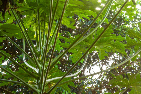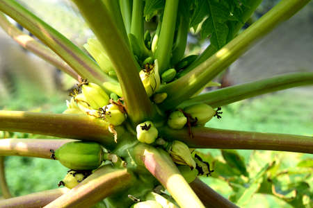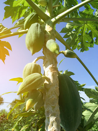 Papaya fruit on a beautiful blooming tree. Sunlight hits the leaves
