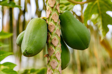 Papaya fruits, or pawpaw, growing on a tree at kibbutz plantation