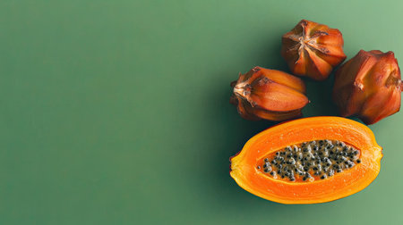 close-up photo of a ripe papaya slice with visible seeds and a bright orange color, placed on the lower-right of a muted green background. The top left area is open for mockup or advertising --no people man woman --chaos 12 --ar 16:9 --style raw --stylize 250 --weird 150 --v 6.1 Job ID: 30e8685c-6536-4190-b3a5-ca6ee679f517