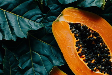 Fresh papaya halves with black seeds placed on vibrant green tropical leaves creating a colorful and healthy food backdrop. Healthy eating and tropical concept.