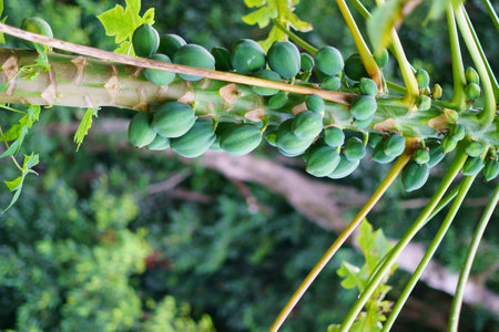 Explore the lush beauty of green papayas growing in a tropical garden.