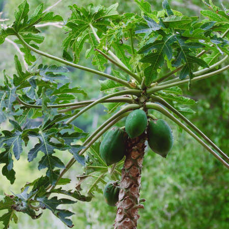 Green papaya tree with ripening fruits in the rainforest. Growing fruits and vegetables in the tropics.