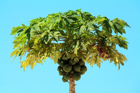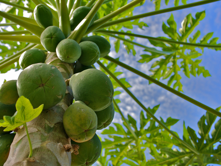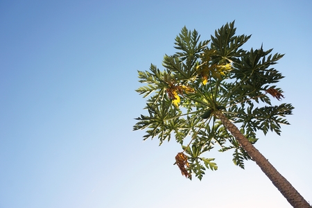 Papaya tree with fruits on blue sky background. Growing green papaya fruits