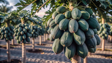 Explore the lush beauty of green papayas growing in a tropical garden.