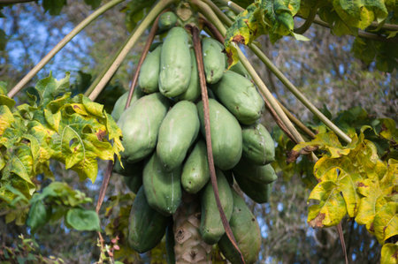Papaya tree with bunch of ripe green papaya fruits on plantation
