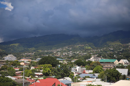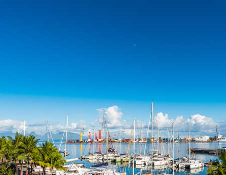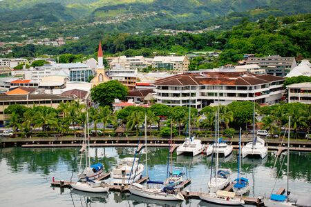 Papeete is the capital city of French Polynesia, an overseas collectivity of the French Republic in the Pacific Ocean. View from the merchant cargo container vessel berthed in the port, container terminal on the typical architecture and marina with yachts
