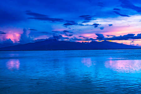 Colorful Sunset Reflection Tahiti Island Blue Water Moorea Tahiti French Polynesia. Different blue colors in water in lagoon and coral reefs