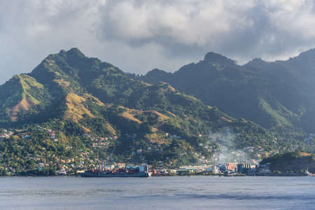 Campden Park, Saint Vincent and the Grenadines - December 19, 2018: Landscape of the island of Saint Vincent. The Campden Park industrial zone and Container Port in the foreground. Sea, mountainous coast and bay.
