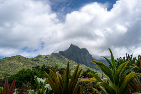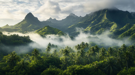 Mount Temetiu, the highest peak of Hiva Oa in French Polynesia, rises through mist and clouds. Its lush green slopes contrast with the rugged volcanic rock formations of the Marquesas Islands