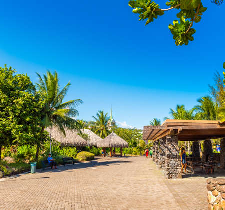 TAHITI, FRENCH POLYNESIA - SEPTEMBER 18, 2018: City alley with gazebos and benches. Copy space for text