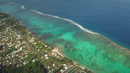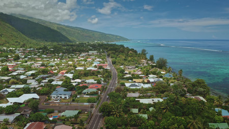 Breathtaking aerial view showcasing the idyllic beauty of Tahiti island. With colorful houses lining a coastal road. Lush green vegetation. And crystal-clear turquoise waters under a vibrant blue sky