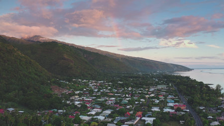 Aerial view showcasing a vibrant sunset casting a warm glow over a coastal town nestled between a lush green mountain range and the tranquil ocean in French Polynesia.
