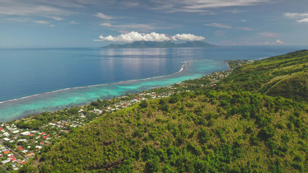 Lush green tropical forest covers Tahiti hilly mountain terrain, colorful village houses along coastline, Moorea island on horizon under cloudy sky. Remote nature, exotic summer travel. Aerial shot