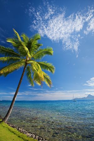 Single palm tree agains blue sky on the beach