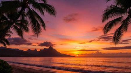 Tropical sunrise with coconut palm trees and ocean.
