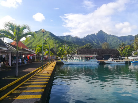 PAPEETE, FRENCH POLYNESIA - APRIL 14 , 2017: The Beautiful sea , resort and sailing boats in Moorea Island at Tahiti PAPEETE, FRENCH POLYNESIA.