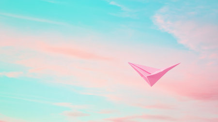 A whimsical paper airplane in soft pink navigates a dreamlike sky, featuring gentle pastel clouds and calming blue tones, evoking feelings of freedom and imagination.