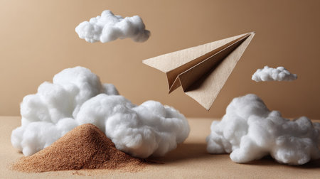 A paper airplane soars gracefully above fluffy cotton clouds and a sandy hill, creating a serene, minimalist scene that evokes feelings of freedom and imagination.