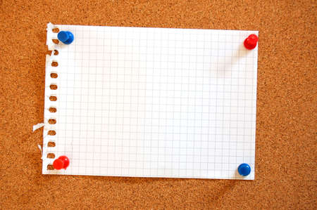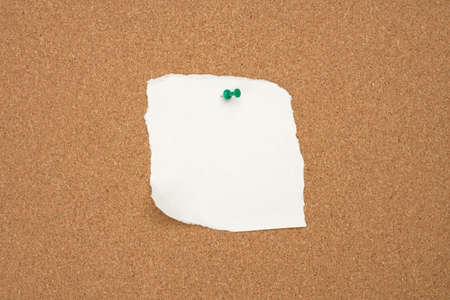 torn white blank white sheet of paper affixed with a plastic button on a brown cork board, copy space
