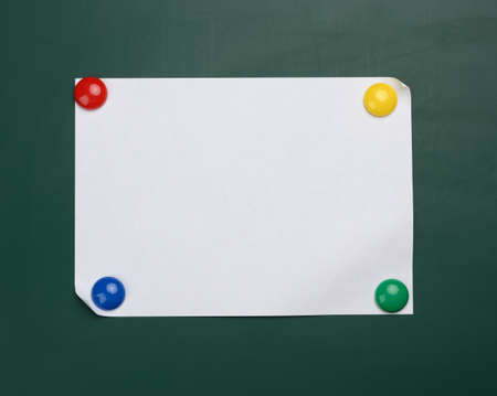 blank white sheet of a4 paper hanging on a green magnetic board. Place for inscription
