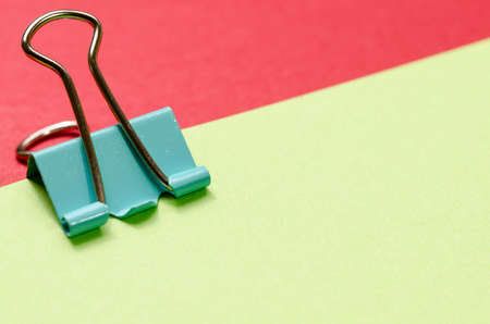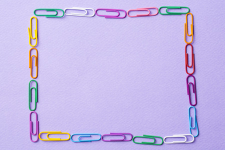 Group od colorful paper clips on blue and purple sheets of blank craft paper