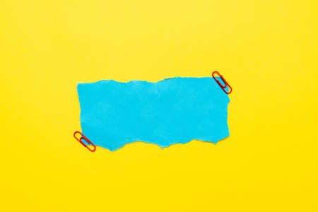 Colorful paper clips on bright blue and yellow background. Minimalist concept flat lay.