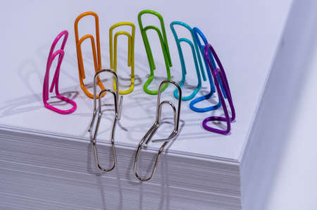 A side view from above of curved metal white paper clips sitting on the edge of a stack of white paper. There are colored paper clips around. The concept of group communication