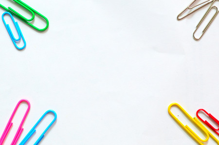 Multi colored paper clips on empty sheet, blue, orange and Green tones. Back to school. High quality photo
