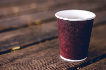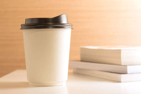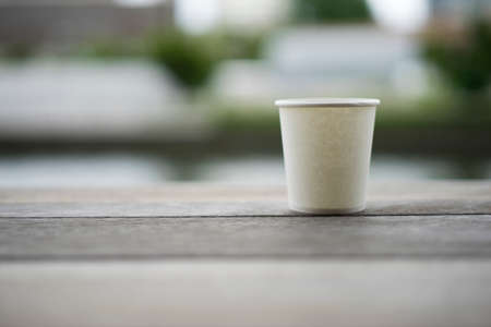 Soft focus of white paper cup on wood table.