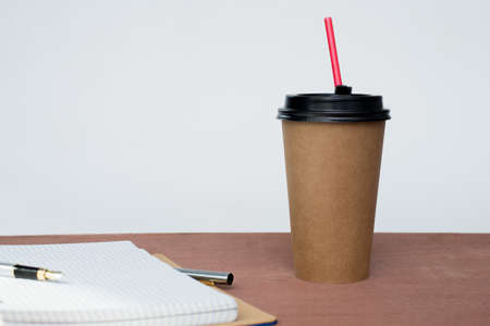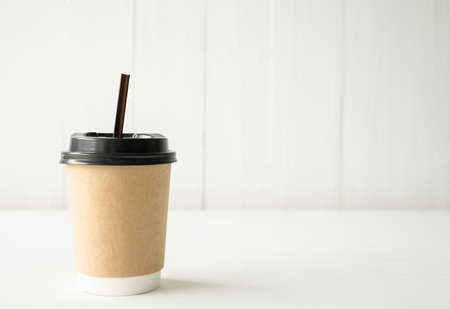paper cup of coffee and plastic brown straw on white wood table in the morning copy space for your text