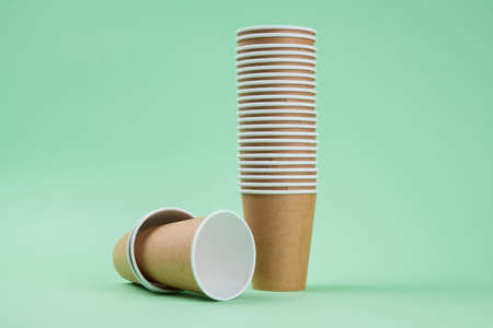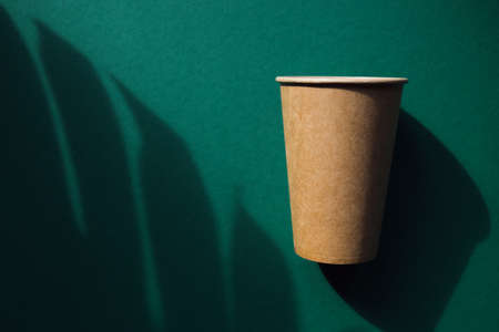 Eco friendly craft paper cup on green background with monstera leaf shadow. Recycling concept. Zero waste theme
