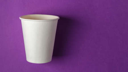 Disposable empty white paper cup on the vivid purple background