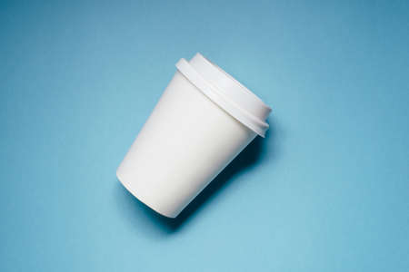Disposable white coffee cup on blue background. Top view with copy space