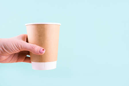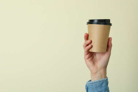 Female hand hold paper cup on beige background