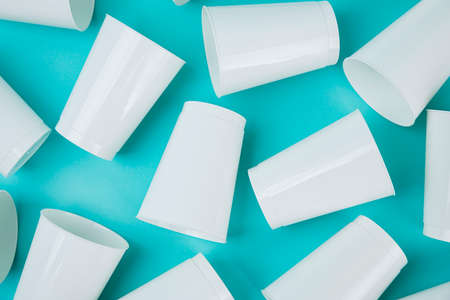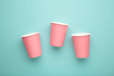 Disposable pink paper cups on blue background.