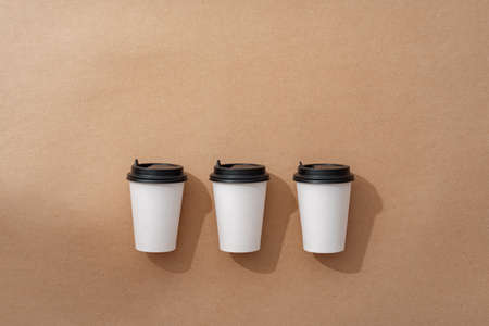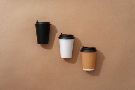 Three eco friendly paper craft cups for coffee to go with black lid on the white background. Zero waste, plastic free concept. Sustainable lifestyle. Composition with front view.