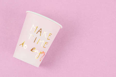 Wording Make time to enjoy on pink paper cup on pink background.