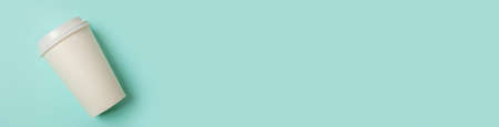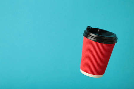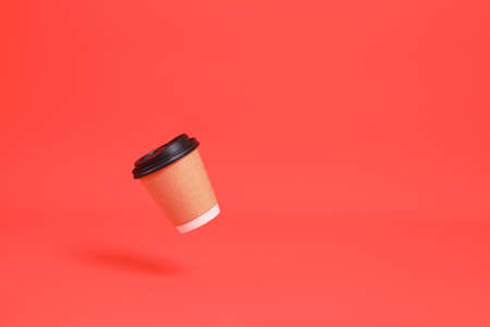 Levitating disposable coffee cup takeaway banner, copy space. Cup clean surface mock up. Place for text, logo, announcement.