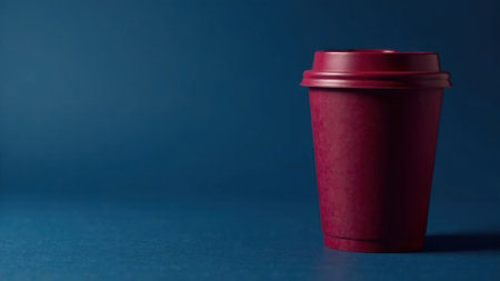Burgundy paper cup for hot drinks stands on a blue background. space for text