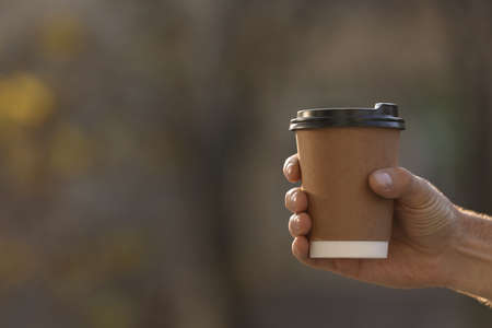 Man with takeaway coffee cup outdoors, closeup. Space for text