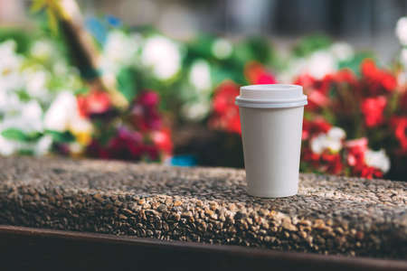 White paper cup with coffee on the street on a background of blurry colors. Disposable cup with plastic cap with place for text. Disposable tableware. Restaurant or cafe menu. Coffee to go. Takeaway