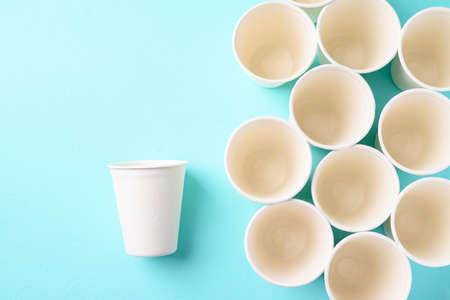 Many white and one brown paper cups, flipped upside down on a light background. Top view, flat lay. Banner.