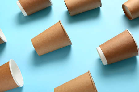 One paper cups for coffee or tea on blue background.