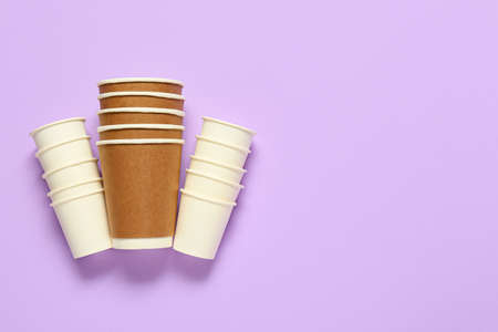 Stack of lilac paper cups for coffee. Disposable glasses on a purple background. Eco-friendly dishes. Copy space. Selective focus.