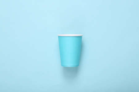 Empty blue cardboard coffee cup on blue background. minimalism