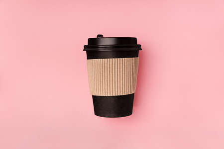 Disposable paper black cup with plastic lid and cuff for takeaway drink coffee, which is then recyclable. Mock up flat lay on pink background