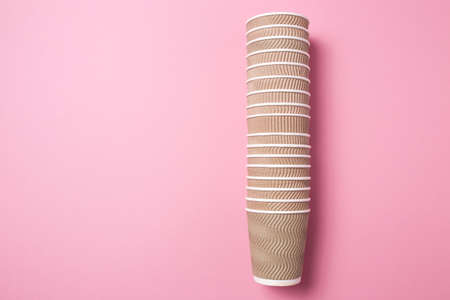 A stack of paper cups for hot drinks on a pink isolated background.