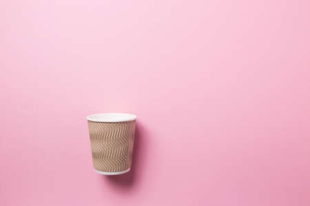 Paper corrugated dark brown cup for coffee on a pink background. copyspace.