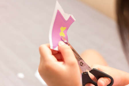 The little girl is cutting color paper. The little girl makes handcraft.