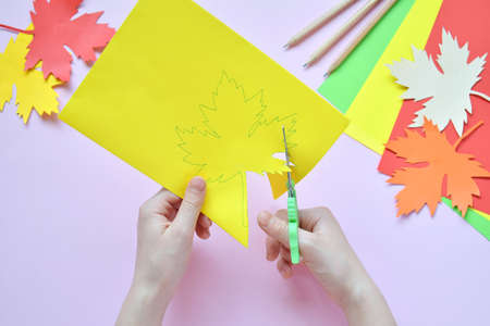 Making maple leaf from colored paper with your own hands for decoration of greeting card. Handmade crafts. Hello Autumn concept. Children's DIY. Copy space. Step 2. Cut out leaf